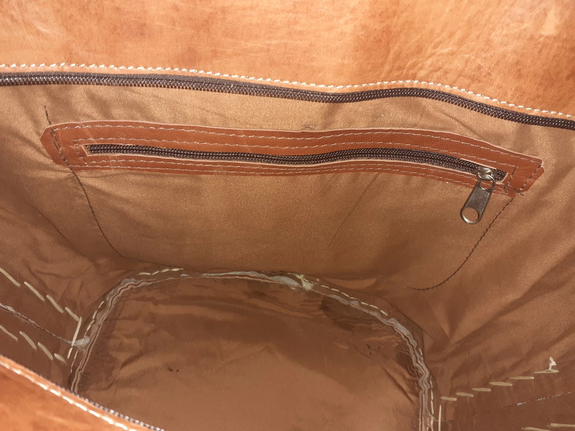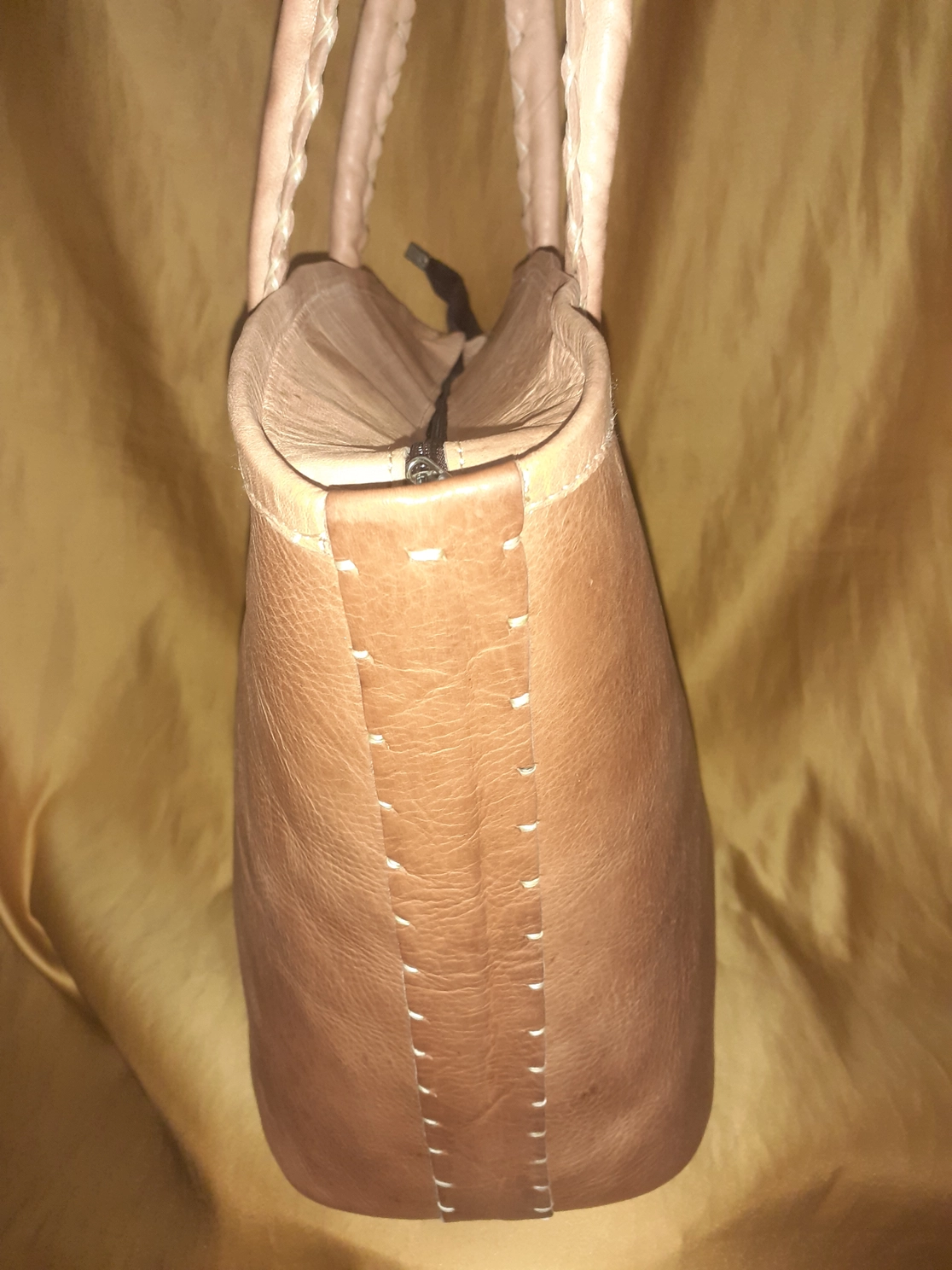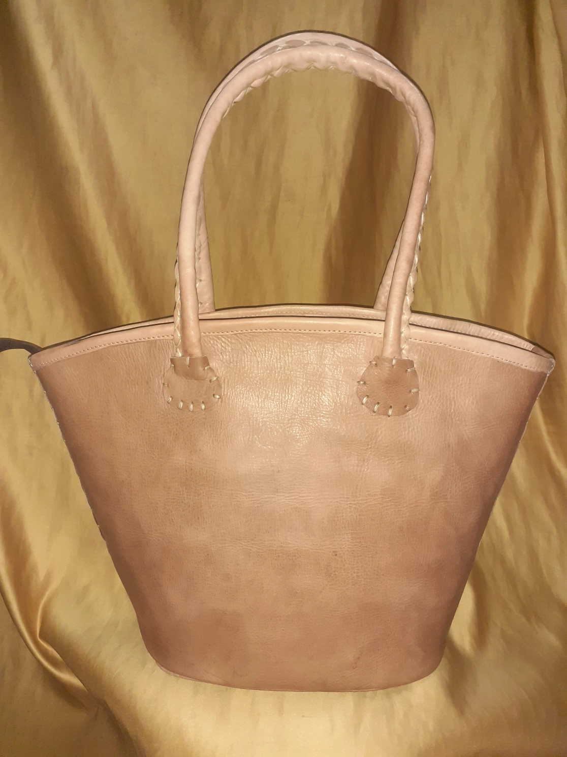 Capazo de palma natural con asas largas de cuero de vaca, pensado para un uso cómodo y práctico.